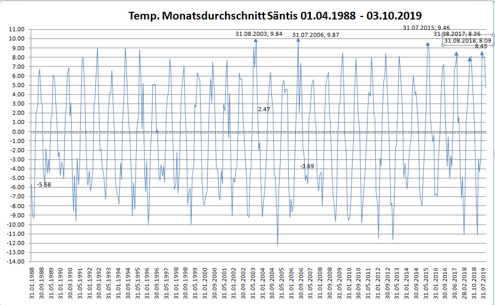 Säntis Monatsmittel vom 01.04.1988 - 03.10.2019