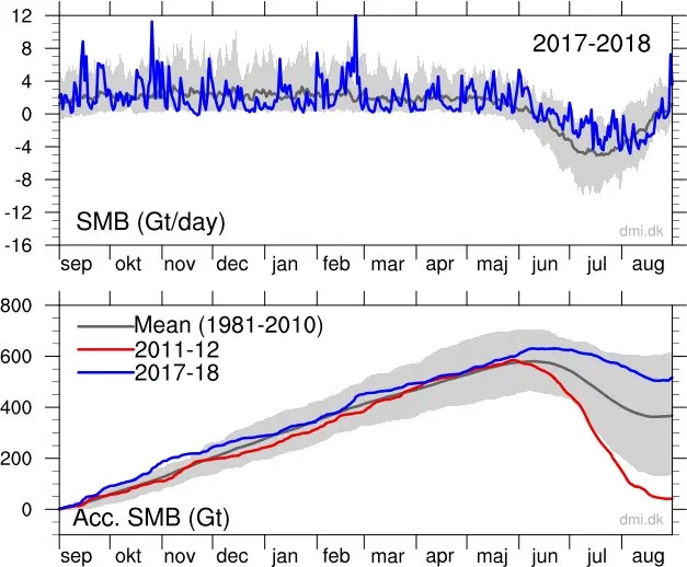 Für dieses Jahr errechnete das DMI eine Gesamtmenge von 517 Mrd. Tonnen SMB, was fast 150 Mrd. Tonnen über dem Durchschnitt der Jahre 1981-2010 liegt und knapp hinter der Saison 2016-17 als sechsthöchster Wert in der Aufzeichnung rangiert (im Gegensatz dazu war die niedrigste SMB in der Aufzeichnung 2011-2012 mit nur 38 Mrd. Tonnen).