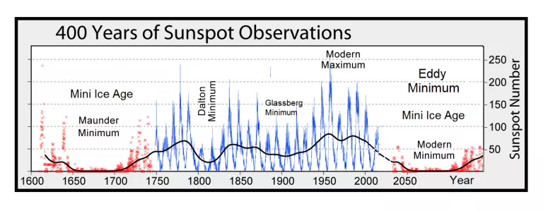 Wenn man zwischen den Zeilen liest, scheinen sowohl die NOAA als auch die NASA dem zuzustimmen, wenn man zwischen den Zeilen liest, dass die NOAA sagt, wir nähern uns einem "ausgewachsenen" Grand Solar Minimum in den späten 2020er Jahren, und die NASA diesen bevorstehenden Sonnenzyklus (25) als "den schwächsten der letzten 200 Jahre" ansieht, wobei die Behörde hier frühere Sonnenabschaltungen mit längeren Perioden globaler Abkühlung korreliert.