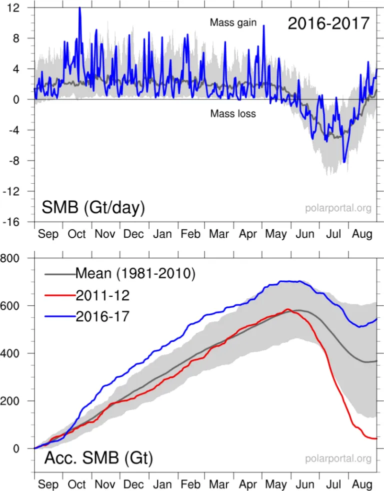 Für das SMB-Jahr 2016-17 hat der grönländische Eisschild 544 Milliarden Tonnen Eis gewonnen (im Vergleich zum Durchschnitt der Jahre 1981-2010 von 368 Milliarden Tonnen).