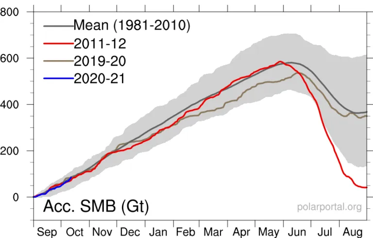 Die SMB 2019-20 hat nach ihrem kürzlichen Ende (31. August) die relativ geringen Zuwächse von 2018-19 wieder rückgängig gemacht, wobei 349 Milliarden Tonnen zum Eisschild hinzukamen, was dem Durchschnitt von 1981-2010 von 368 Milliarden Tonnen sehr nahe kommt. Der DMI beschrieb das Jahr als "normal", und die Gewinne scheinen die Dinge wieder auf den Wachstumstrend nach 2012 gebracht zu haben.