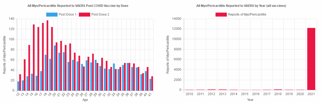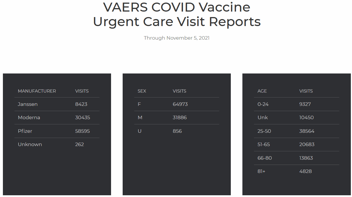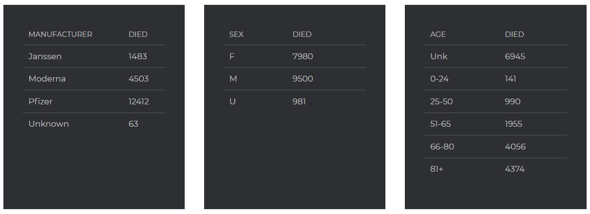 Anzahl gemeldeter Nebenwirkungen des Pfizer-/Biontech Covid-19 Impfstoffs. Es wird davon ausgegangen, dass nur ca. 1% bis 3% der Nebenwirkungen und Todessfälle gemeldet werden.