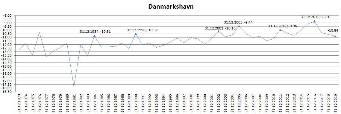 Auch bei dieser Station ist die Abkühlung als dramatisch zu bezeichnen. Bei Danmarkshavn wurde 2016 mit einem Jahresmittel von -8.81° Celsius der höchste Wert aufgezeichnet. 2019 ist mit -10.84° Celsius seit Aufzeichnungsbeginn eines der kältesten Jahre. 1984 wurde ein Jahresmittel von -10.81° Celsius aufgezeichnet. 2019 ist damit um -0.03° Celsius kühler als 1984. Die Abkühlung seit 2016 beträgt 2.03° Celsius. Das sind pro Jahr eine Abkühlung um 0.67° Celsius.
