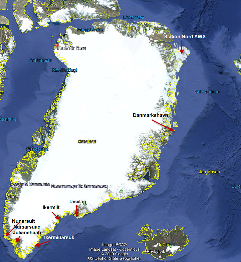 Rund um Grönland existierten in den letzten 60 Jahren diverse Messstationen, die im Lauf der Jahre wieder aufgegeben wurden. Wir haben insgesammt 9 Stationen rund um Grönland gesucht, die über einen längeren Zeitraum bis Heute konsistente Datenbestände aufweisen. 1 Station, Narsarsuaq, wurde leider vor einigen Jahren aufgegeben.