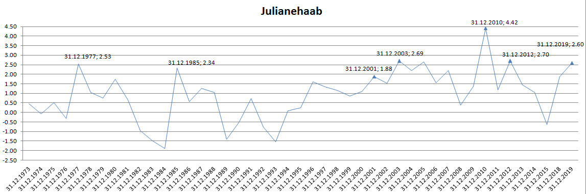 Bei Julianehaab wurde 2010, wie bei Nunarsuit und Thule, das wärmste Jahr, mit einem Jahresmittel von 4.42° Celsius aufgezeichnet. Danach folgte 2012 mit noch 2.70° Celsius und 2019 mit 2.60° Celsius. Auch hier eine deutliche Abkühlung seit 2010 von 1.82° Celsius. Damit ist 2019 fast auf dem Niveau von 1977! Zumindest bei dieser Region Grönlands.