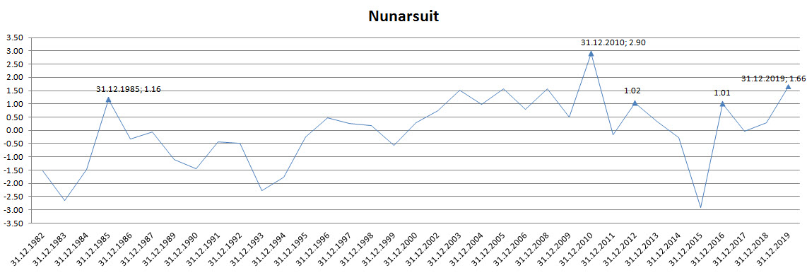 Bei  Nunarsuit war 2010 das wärmste Jahr, wie bei der Station Thule. Das Jahresmittel bei Nunarsuit beträgt 2.90° Celsius. 2012 war mit noch 1.02° Celsius deutlich kühler. Während 2016 mit 1.01 nur marginal kühler war, als 2012. Eine deutliche Abweichung wurde 2015 mit einem Jahresmittel von -2.92° Celsius aufgezeichnet. Im Vergleich mit 2010 wäre dies eine Abkühlung von exorbitanten 5.82° Celsius. Doch wie bereits erwähnt, erholte ich das Jahresmittel wieder und lag letztendlich 2019 bei 1.66° Celsius.