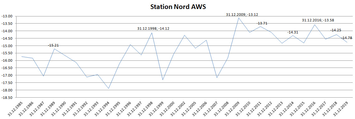 Im Nordosten Grönlands bei der "Station Nord AWS" ist die Temperaturentwicklung der letzten 20 Jahre besonders interessant. Hier wurde 2009 mit -13.12° Celsius das wärmste Jahr aufgezeichnet. Es ist wohl kaum anzunehmen, dass bei diesem Durchschnitt die Tagesmitteltemperaturen jemals den Taupunkt erreichten. In den darauffolgenden Jahren kühlte es kontinuirlich ab 2011 mit -13.71° Celsius, 2014 -14.31° Celsius, 2016 -13.58° Celsius, 2018 -14.25° Celsius und 2019 mit -14.79° Celsius ab.