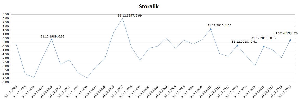 Der Trend, der bei der vorherigen Station Nord aufgezeichnet wurde, wurde auch bei der Station Storalik aufgezeichnet. Storalik liegt im südlichen Teil Grönlands.