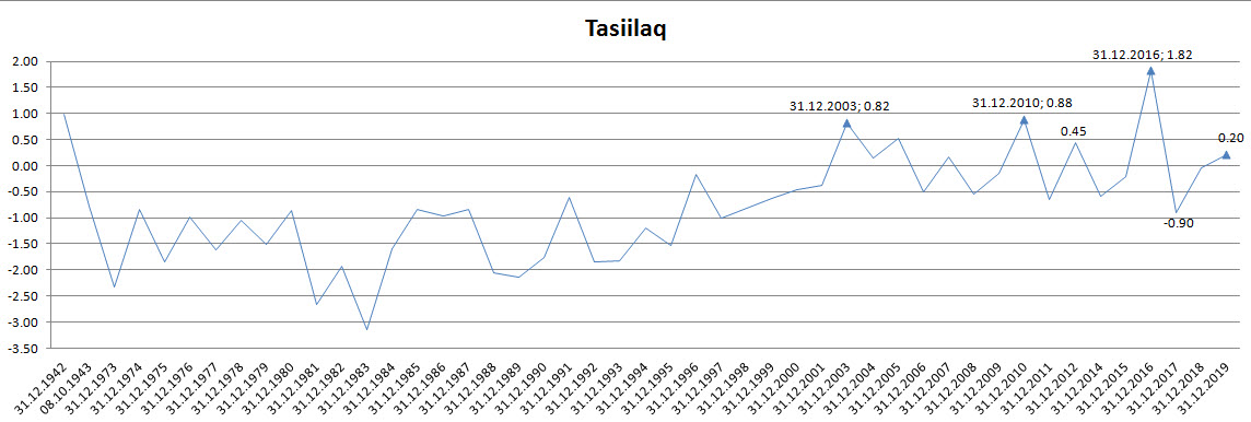 Aus dem Diagramm geht hervor, dass in Tasiilaq nicht 2010 das wärmste Jahr was, sondern 2016. Das Jahresmittel der Temperaturentwicklung lag 2016 bei 1.82° Celsius. 2019 betrug das Jahresmittel nur noch 0.20° Celsius. Eine Abkühlung von 1.62° Celsius. Somit ist 2019 kühler als 2003 mit 0.82° Celsius und 2010 mit 0.88° Celsius. Die Abkühlung zwischen 2016 und 2019 beträgt somit 1.62° Celsius und im Vergleich mit 2003 0.6° Celsius.