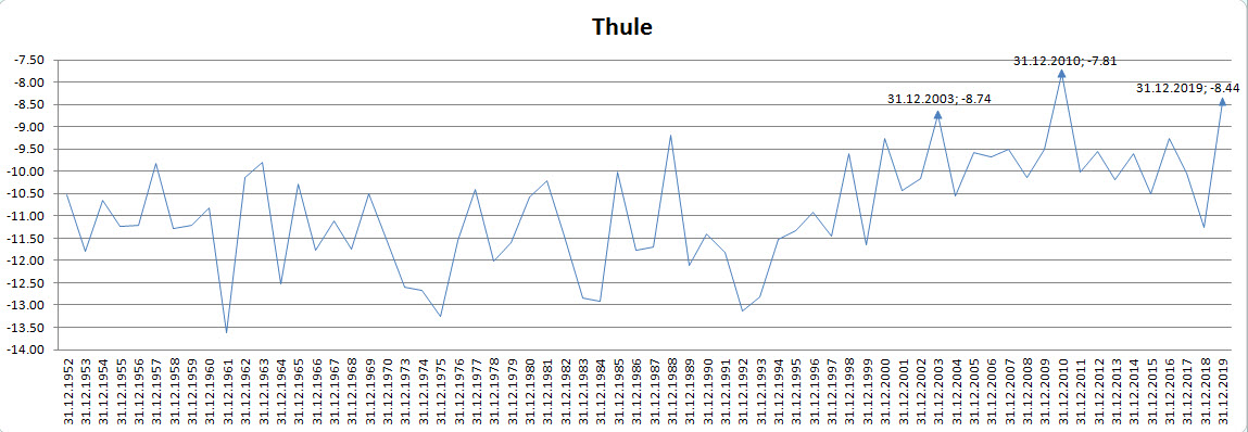 Thule wies 2010 mit einem Jahresdurchschnitt von -7.81° Celsius das wärmste Jahr aus. Ob es im Sommer Zeiten gab, bei denen die Temperaturen über den Gefrierpunkt stiegen, ist nicht Gegenstand dieser Auswertungen.