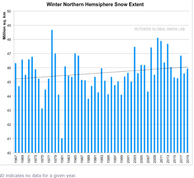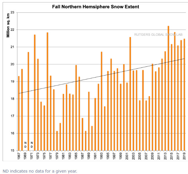 Daten der Universität von Rutgers zeigen, dass die Schneebedeckung auf der Nordhalbkugel im Herbst und Winter seit Beginn der Datenaufzeichnung im Jahr 1967 tendenziell gestiegen ist.
